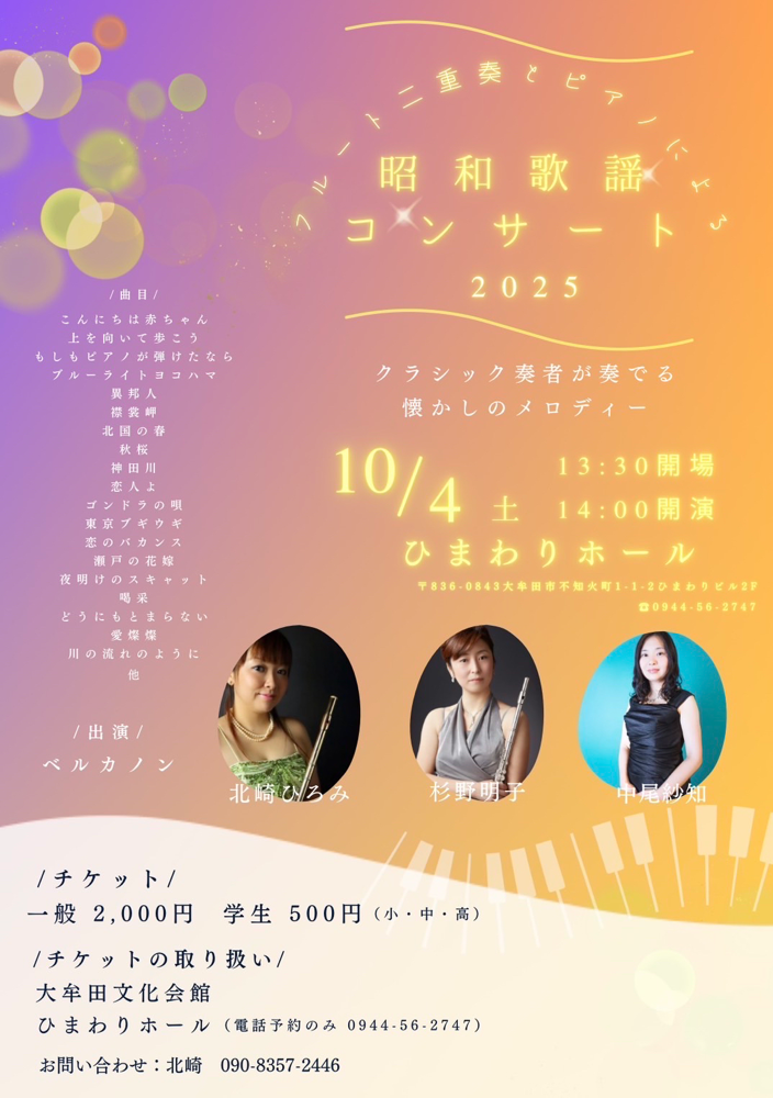 秋、冬のコンサートです。 このほかにも、隣町の式典や、学校コンサートなどなど、秋はたくさんのコンサートで演奏します。 10月4日はクラシック奏者が奏でる懐かしのメロディ『昭和歌謡コンサート』を行います。フルート二本とピアノでのアンサンブルで昭和の名曲をたくさん演奏しますので、是非お誘い合わせの上、お越しください😊...